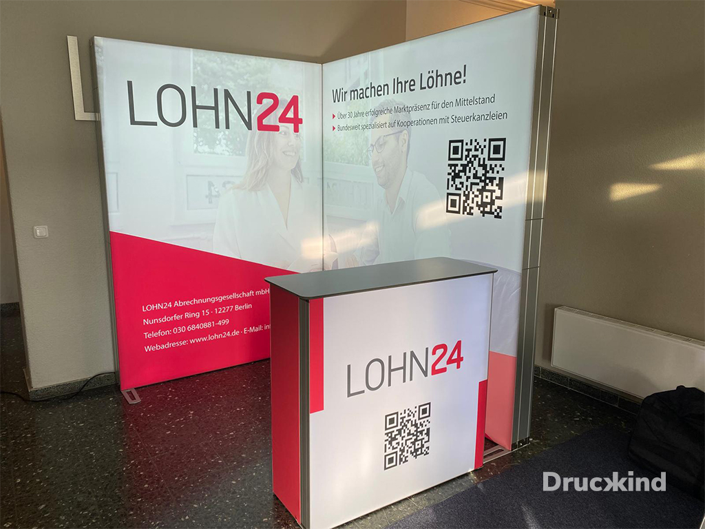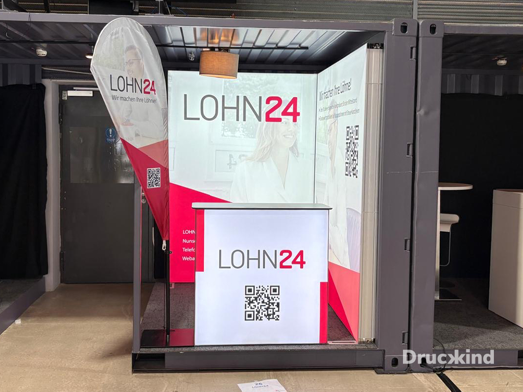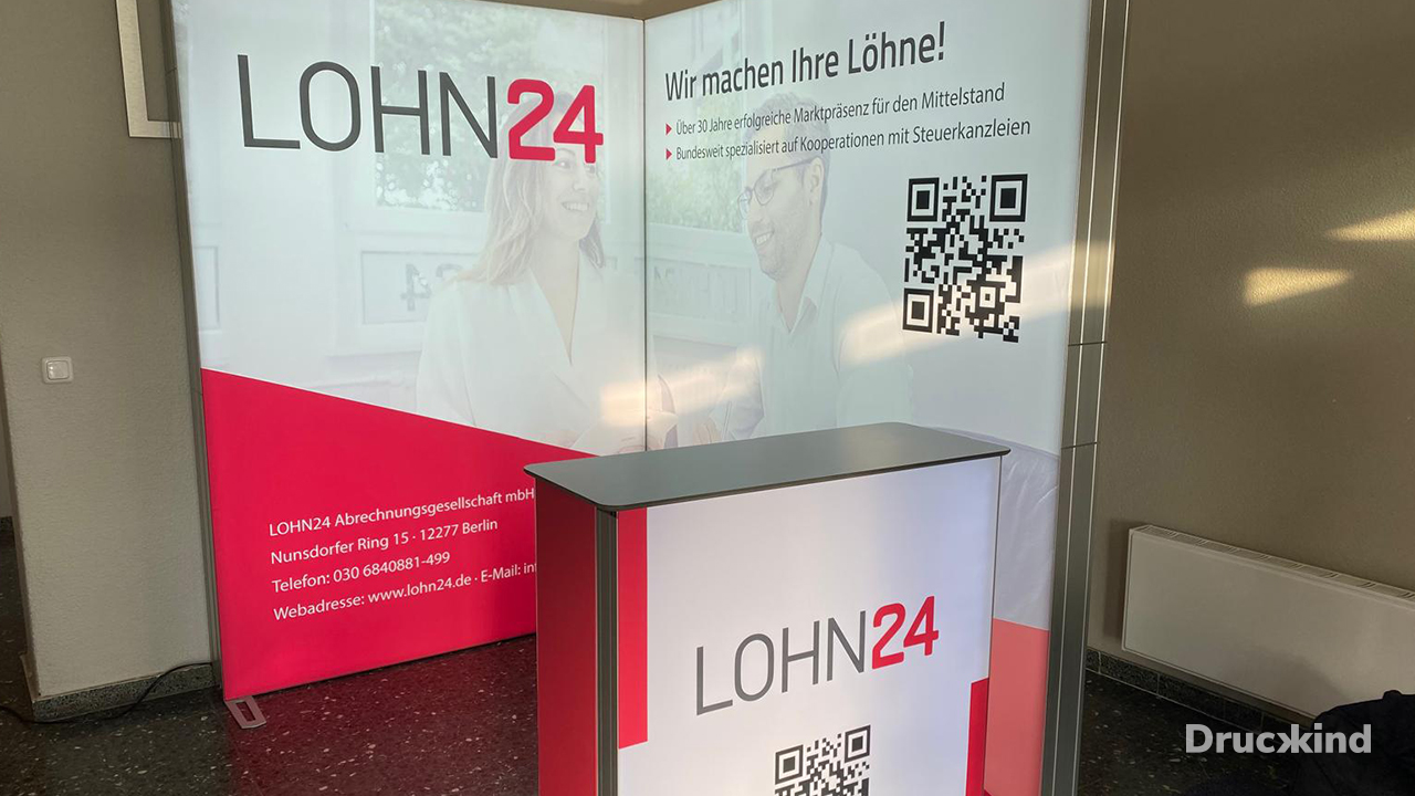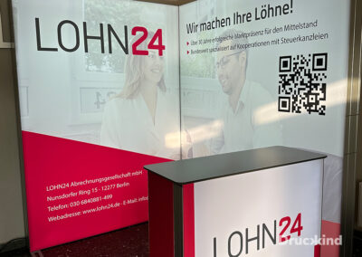 Insgesamt bietet dieser Messestand von Lohn24 eine perfekte Kombination aus hoher Sichtbarkeit, schneller Montage und professioneller Präsentation – und ist damit besonders gut geeignet für Unternehmen, die bei ihren Messeauftritten Kompetenz, Qualität und modernes Design ausstrahlen möchten.