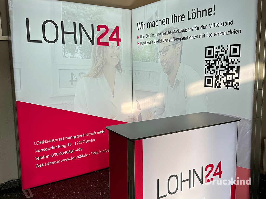 Beide Module sind mit einer hochwertigen LED-Beleuchtung ausgestattet, die das Spanntextil von innen heraus gleichmäßig ausleuchtet und so für eine besonders strahlende, aufmerksamkeitsstarke Darstellung sorgt. Das verwendete Spanntextil mit Flachkeder ist speziell für Backlit-Anwendungen geeignet und wurde im 4/0-farbigen Digitaldruck individuell für Lohn24 gestaltet.